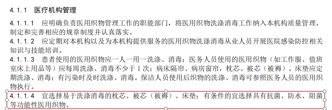 对于医院寝具的选择,新版《医疗机构医用织物洗涤消毒技术标准(WS/T 508 – 2025)》提到,宜选择易于洗涤消毒的枕芯、被芯(被褥)、床垫;有条件的宜选择具有抗菌、防水、阻菌等功能性医用织物。