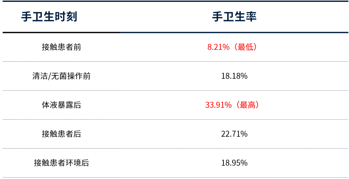 相较于整体依从率偏低,不同手卫生时刻间的差异更值得关注。研究显示,手卫生依从率分布呈现典型且反直觉的特征:接触患者前依从率最低,仅为 8.21%;无菌操作前次之,为 18.18%;体液暴露后依从率最高,达 33.91%。可见,以保护患者为核心的手卫生环节执行情况较差,而偏向自我防护的环节依从性相对更高,具体如下: