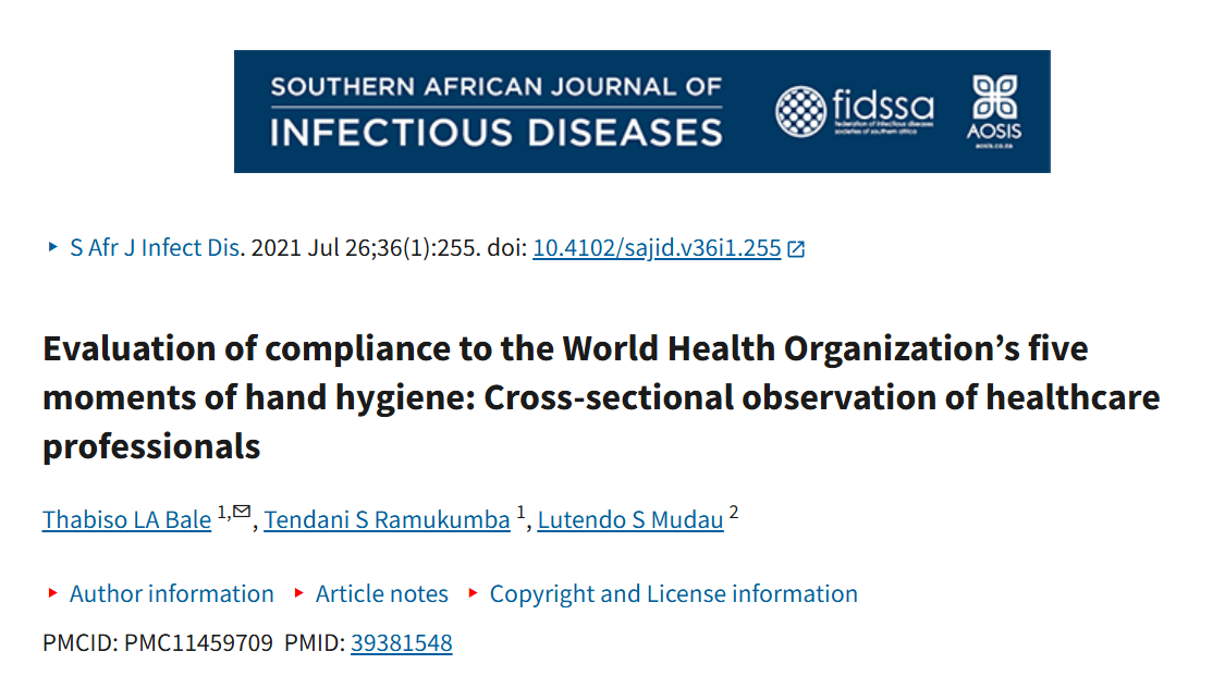 Bale TLA, Ramukumba TS, Mudau LS. Evaluation of compliance to the World Health Organization’s five moments of hand hygiene: Cross-sectional observation of healthcare professionals. S Afr J Infect Dis. 2021 Jul 26;36(1):255. doi: 10.4102/sajid.v36i1.255. PMID: 39381548; PMCID: PMC11459709.